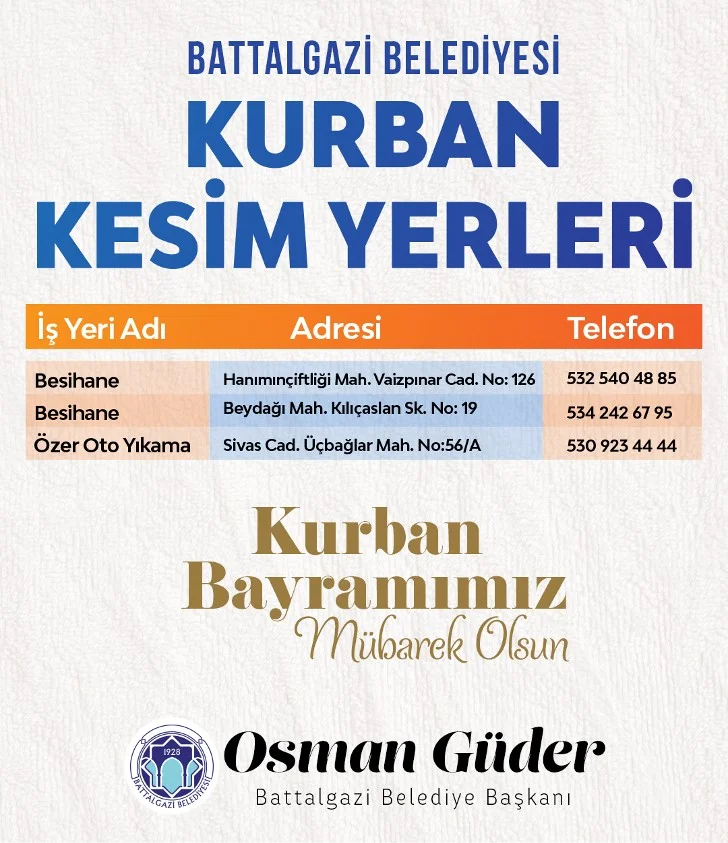 Battalgazi Belediyesine bağlı ekipler, gerekli hijyen kurallarına uyulması, çevrenin kirletilmemesi, kurbanlık hayvanların eziyet görmemesi ve vatandaşların kurbanlarını rahat bir ortamda kesmeleri için gerekli tüm tedbirlerini aldı. Toplum sağlığının korunması adına kurban kesim yerlerinde giriş ve çıkışları da kontrollü bir şekilde sağlayacak olan ekipler, her hangi bir olumsuzluğa mahal vermeme adına önlemleri sıkı bir şekilde uygulayacak. Kurban kesim yerlerindeki çöp alımları da yine belediye ekipleri tarafından yapılacak. Çalışmalar neticesinde ilçede 3 noktada kurban kesim yeri belirlendi.  Belirlenen adresler dışında, cadde, sokak, park ve halka açık alanlarda yapılacak kesimlerde ilgili mevzuatlar çerçevesinde cezai işlem uygulanacak. Battalgazi Belediyesi tarafından belirlenen kurban kesim yerleri ise şöyle: Hanımınçiftliği Mahallesi Vaizpınar Caddesi’nde besihane, Merkez Beydağı Mahallesi Kılıçaslan Sokak’ta bulunan besihane, Uçbağlar Mahallesi Sivas Caddesi Özer Oto Yıkama.