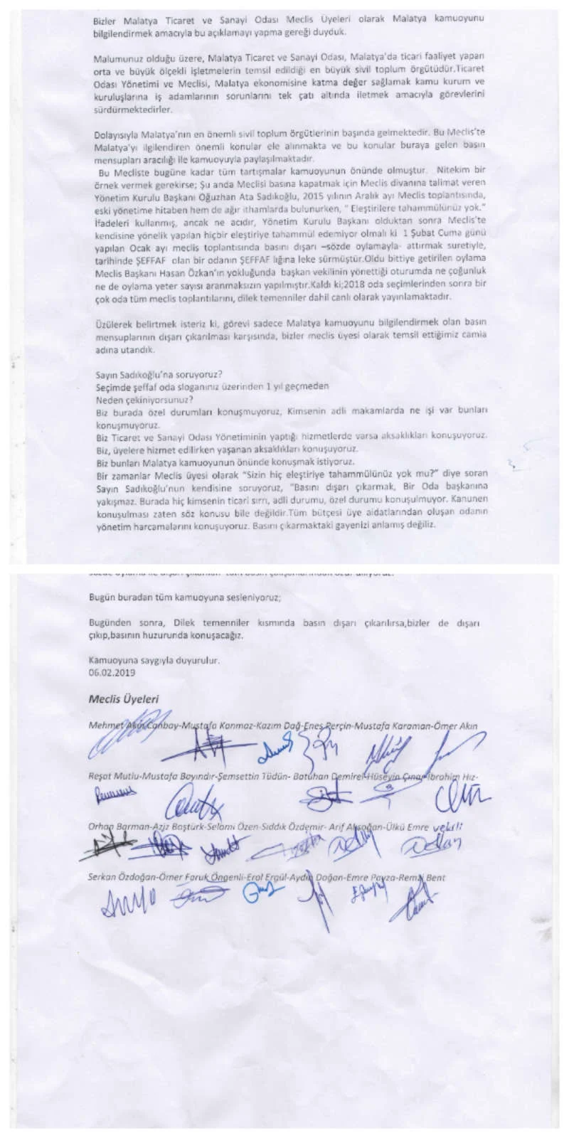 Malatya Ticaret ve Sanayi Odası Meclisi’nde bulunan 24 Meclis üyesi olarak, sırf kamuoyunu bilgilendirmek adına orada bulunan ancak olabilecek eleştiriler kamuoyuna yansımasın diye  sözde oylama ile dışarı çıkarılan  tüm basın çalışanlarından özür diliyoruz.